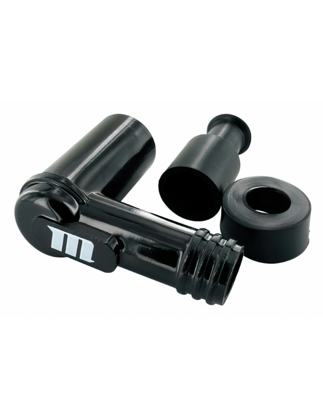 Vous retrouvez ici l'antiparasite en caoutchouc noir avec un angle de 90° modèle indispensable pour les configurations moteur racing puisqu'il est insensible aux vibrations. Raccordement à filetage (à l'intérieur).