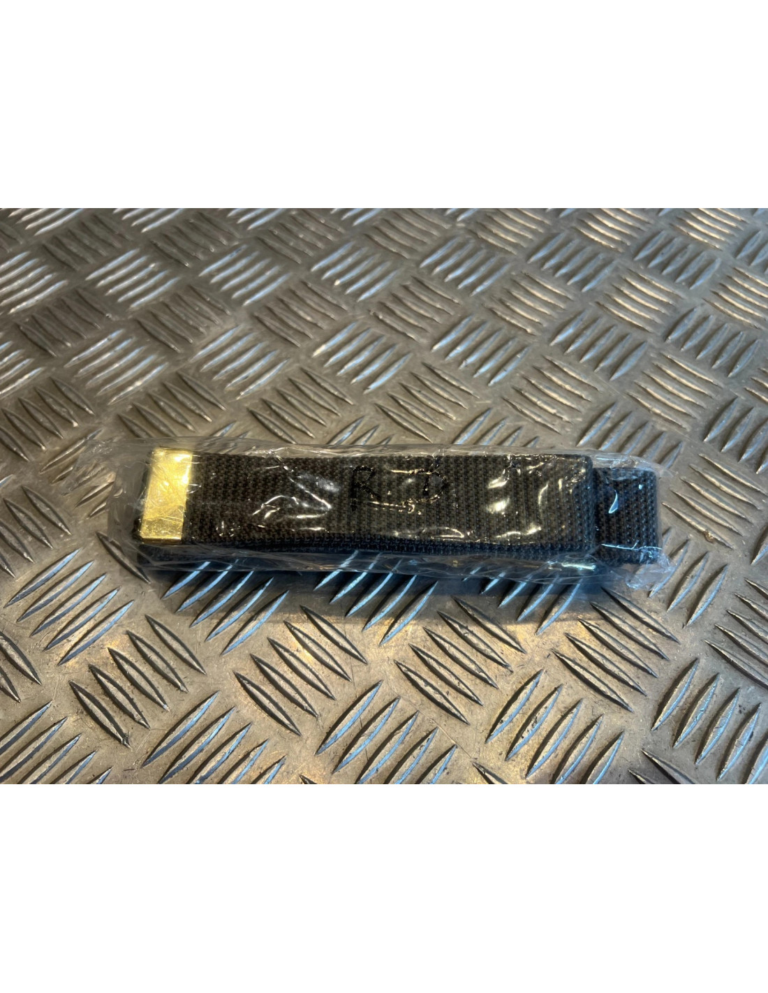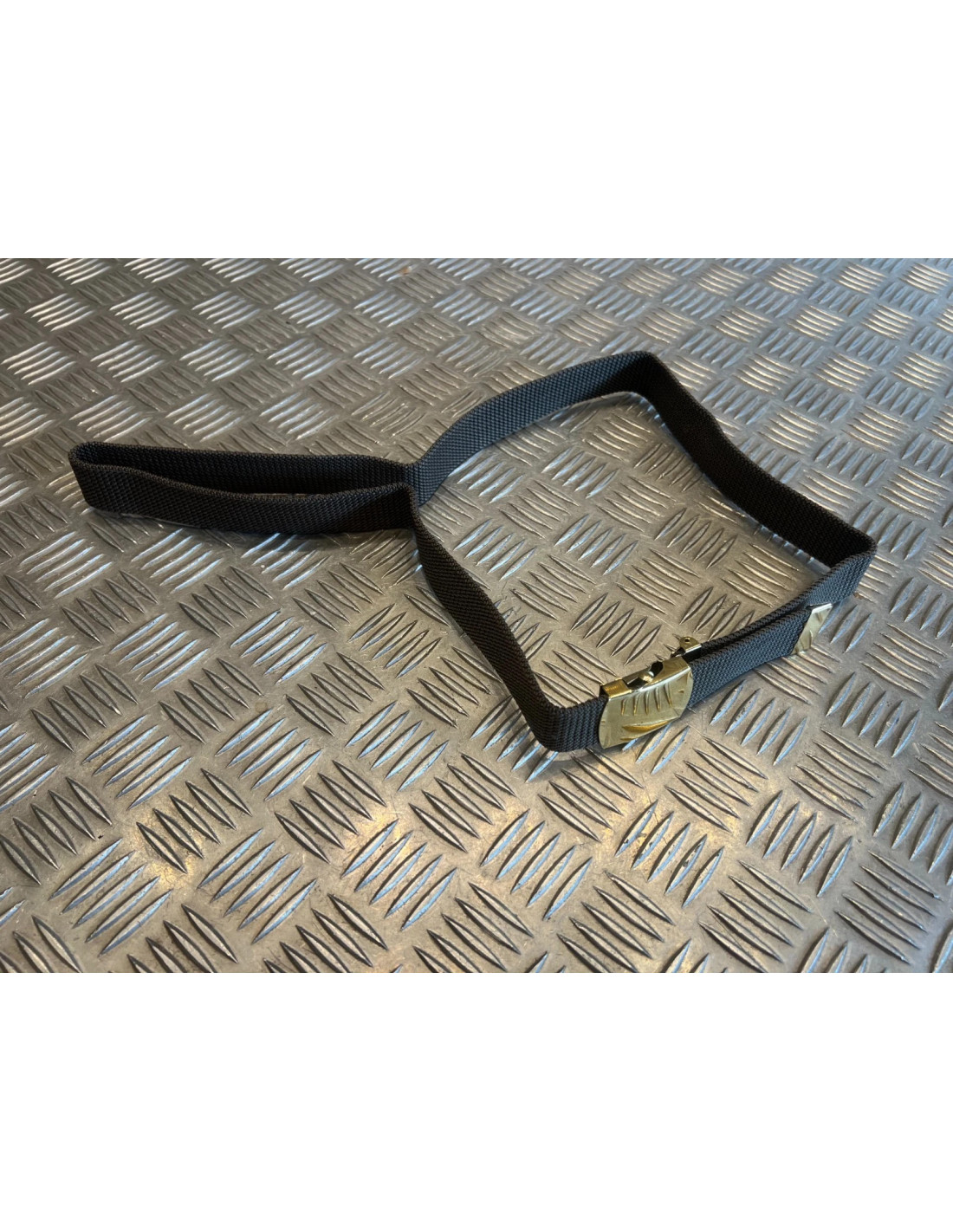 Extrémité métallique de la ceinture dorée.