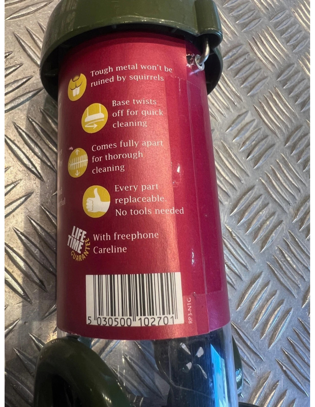 L'hygiène n'a jamais été aussi simple. Il suffit de tordre la base à chaque remplissage, permettant aux graines et débris non consommés de s'échapper. Pour un nettoyage vraiment en profondeur, séparez complètement la goupille pour démonter à la main toutes les pièces de la mangeoire.