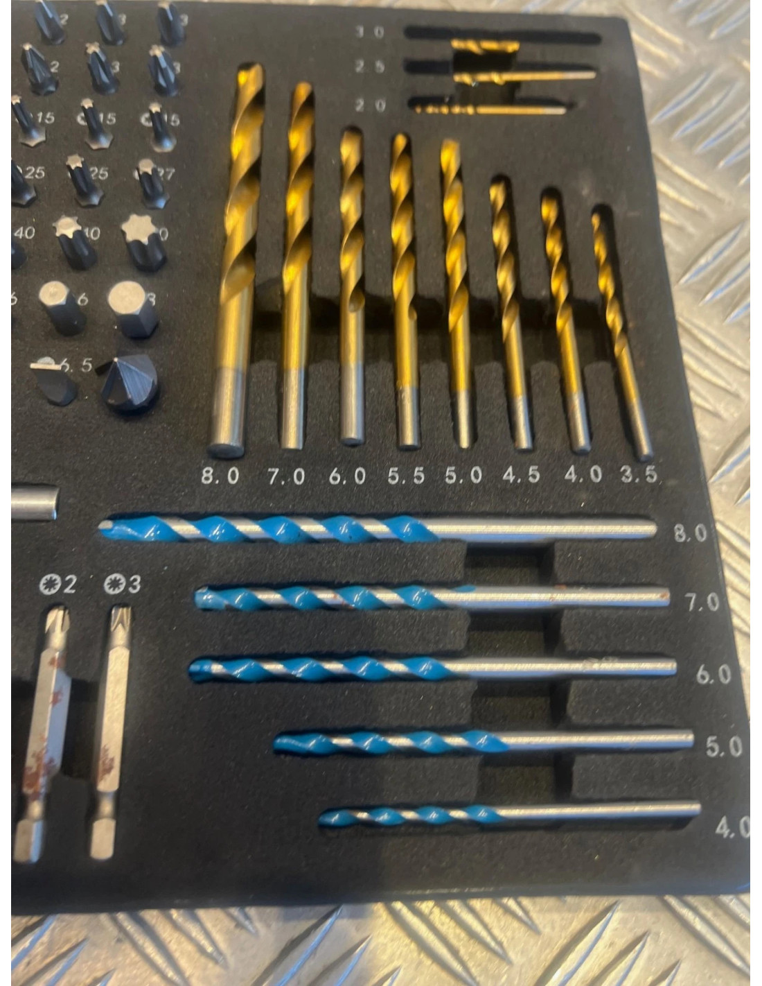 11 forets métaux de 2 à 7mm, 5 forets béton de 4 à 8 mm,