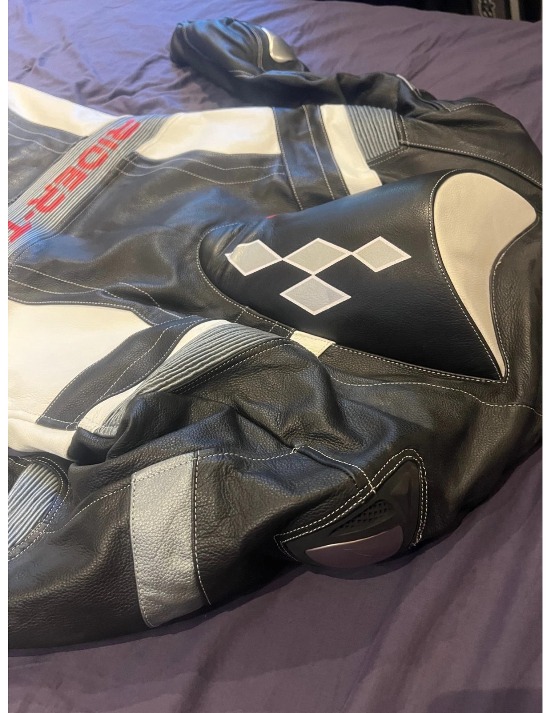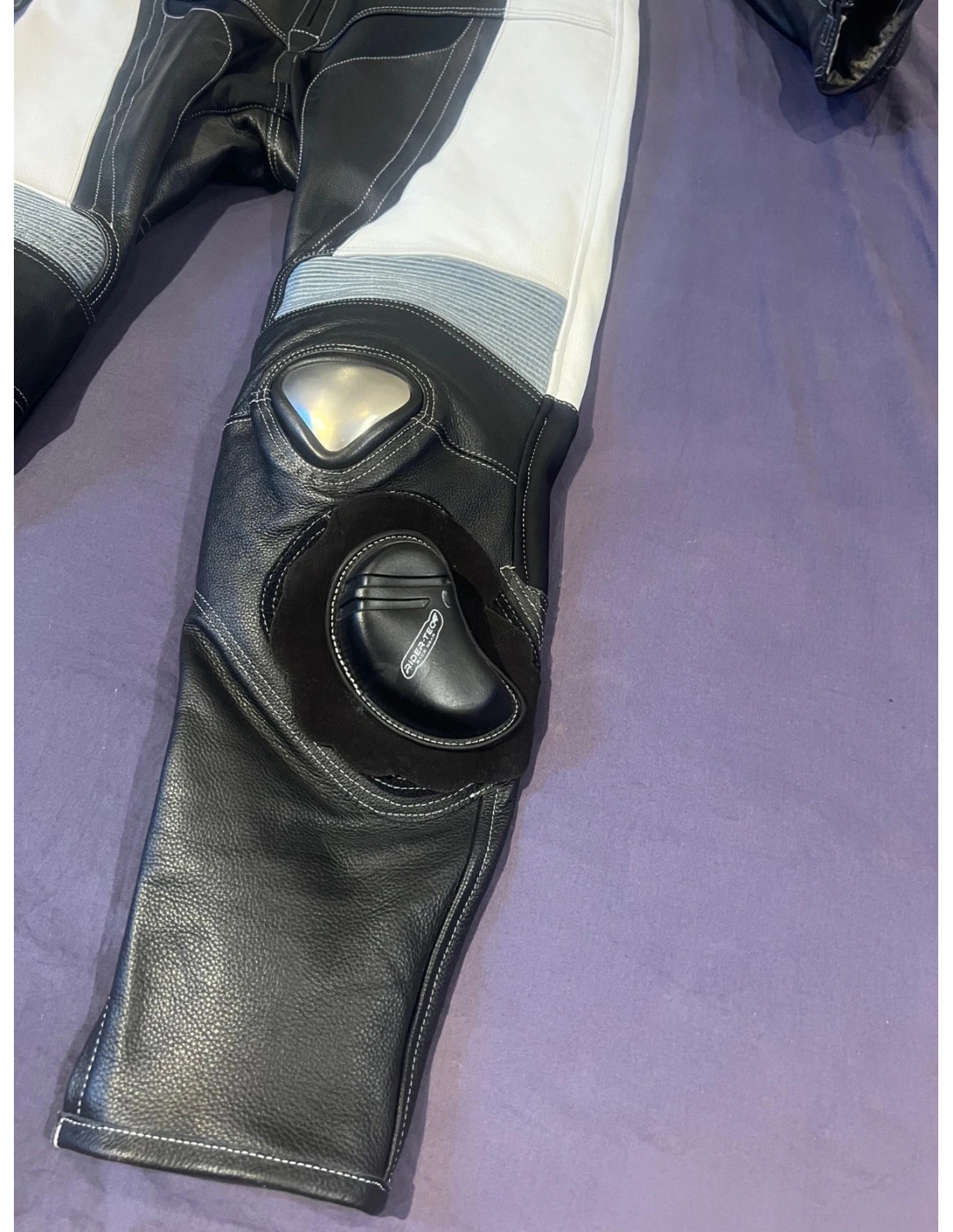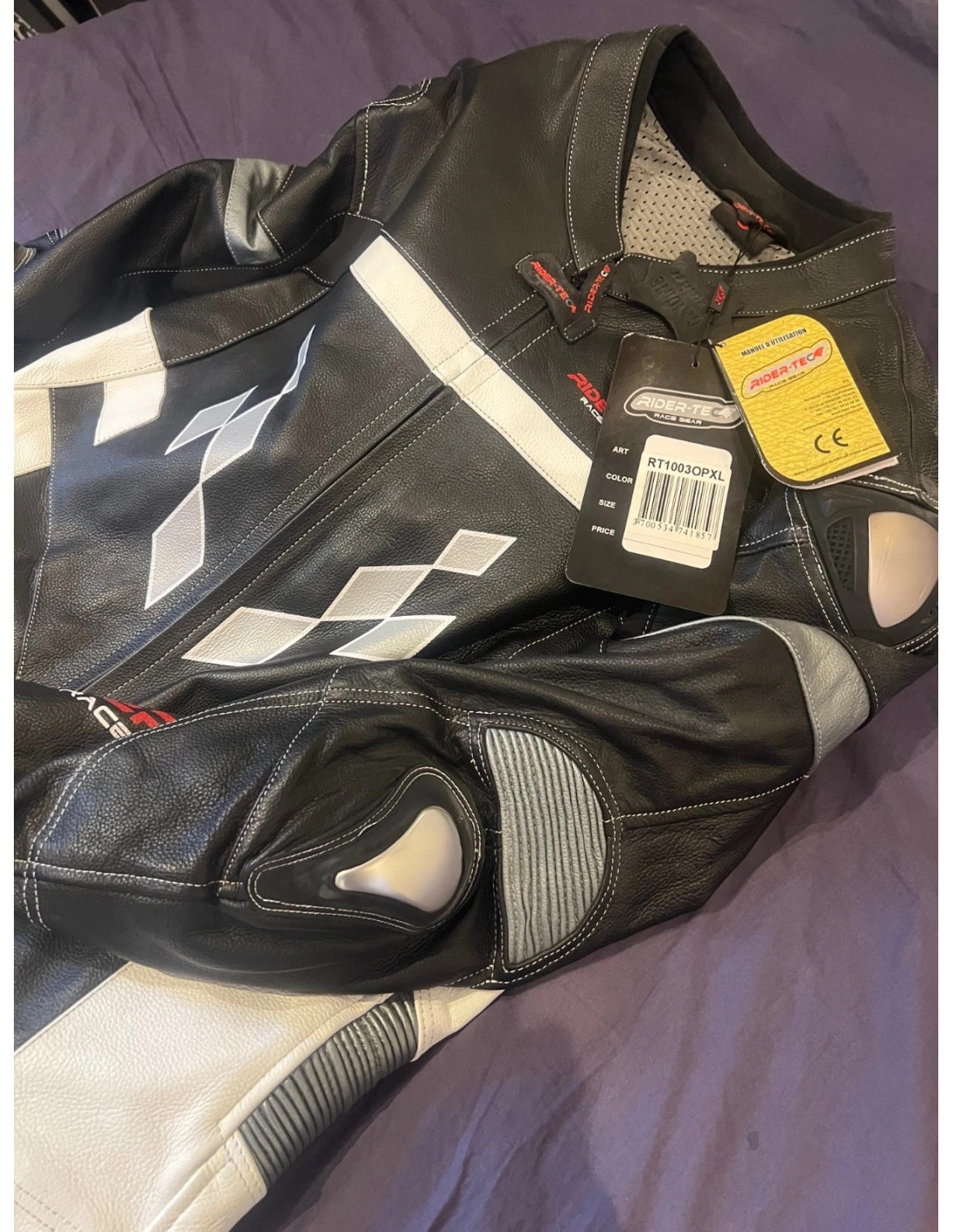 RIDER-TEC- ROAD SUITE. Combinaison à l'allure très sportive, en cuir pleine fleur et de couleur noire, blanche et rouge, permet d'équiper correctement tout amateur de moto en quête d'une combinaison tendance, confortable et adaptée à un haut niveau de sécurité. En effet cette combinaison 1 pièce doté de coques de protections aux genoux homologuées CE EN 1621 ainsi que de protections aux épaules, coudes et dorsale homologuées EN13595.
